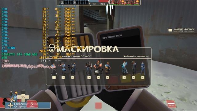 Game: Team Fortress 2 Сomputer characteristics: Socket: LGA 2011 Motherboard: Asus Sabertooth X79 Processor: i7 3930K 3.20GHZ RAM: HYPER X 16GB DDR3-DIMM 1600 GPU: Gigabyte GTX 1060 OC 6GB ROM: HDD 500GB OS+HDD 2TB+ HDD 1TB Video in 1920x1080 resolution. Operating system: Windows 10 Pro