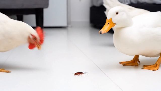 Курица, утка и таракан. Смотреть интересное видео с животными