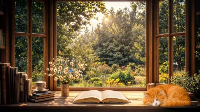 Атмосфера садовой библиотеки: окно, звон колокольчиков и спокойные звуки природы для релаксации