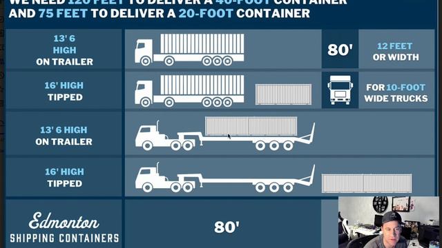 A shipping container tilt deck truck requires at least 80 linear feet to deliver a 20 foot shipping container and 120 feet to deliver a 40 foot shipping container.