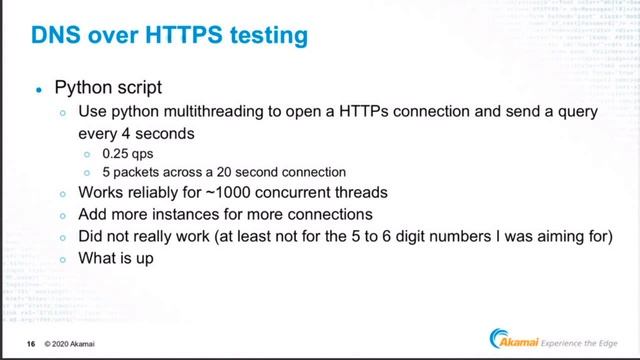 Full Agenda and slides: https://indico.dns-oarc.net/event/33/timetable/#20200208.detailed 0:00:39├─ Motives and methods for managed private network with Encrypted DNS (Paul Vixie - Farsight Security) 0:24:33 └─ Q&A 0:31:35├─ DNS Encryption Operational Experience and Insights (Mark Dokter, Ralf Weber & Bruce van Nice - Akamai) 0:58:21 └─ Q&A 0:59:35├─ Status of DoH / TTR in Firefox (Eric Rescorla - Mozilla) 1:23:19 └─ Q&A