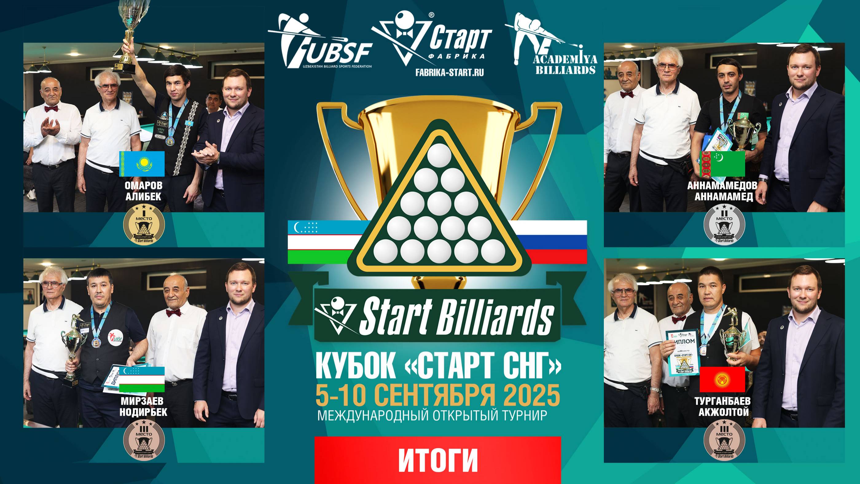 С 5 по 10 сентября проходили матчи Кубка в столице Узбекистана, городе Ташкент, в двух клубах Academia Billiards. В этом году состав Кубка собрал 122 участника, среди которых такие звездные игроки, как Арби Муциев, Ернар Чимбаев, Алибек Омаров, Ызатбек Ратбеков, Азиз Мадаминов, Джамолитдин Кучкаров, Сухроб Пирматов, Зухриддин Хашимов. Жаркая битва в столице Узбекистана шла за внушительный призовой фонд 100 000 000,00 сум! В азиатском регионе много прекрасных мастеров русского бильярда. У каждого участника смог продемонстрировать свои навыки в этом массовом спортивном событии, объединяющим страны. По итогам международного открытого турнира КУБОК «СТАРТ СНГ» 2025 победителями стали: 1 место – Омаров Алибек / Казахстан 2 место – Аннамамедов Аннамамед / Туркменистан 3 место – Мирзаев Нодирбек / Узбекистан 3 место – Турганбаев Акжолтой / Кыргызстан Все участники без исключения дали высокую оценку организации турнира и качеству столов Фабрики «Старт». Безусловно, такие мероприятия способствуют популяризации и развитию бильярда в регионе и укрепляют дружеские связи между странами. Кубок «СТАРТ СНГ» 2025 в очередной раз стал событием, которое объединяет людей через любовь к бильярду!