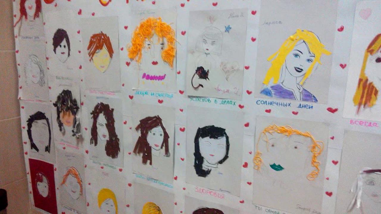 Школьники нарисовали своих мам и рисунки развесили в школе.