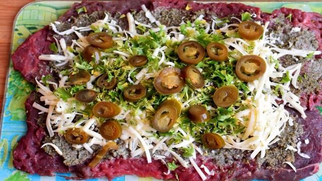 Сочный, ароматный, в меру острый рулет с интересной начинкой вполне может быть как семейным ужином или обедом, так и украшением праздничного стола! Приготовление рулета не займет много времени и не потребует особых навыков или приспособлений. Ингредиенты: Говядина1 кг(мякоть), Песто4-5 ст. ложек, Сыр250 грамм, Петрушка1 пучок, Перец острый маринованный3 ст. ложки, Вино красное сухое3 ст. ложки, Черный перецПо вкусу, Благодарим за просмотр! Подписывайтесь на канал🍕 Поделитесь своим мнениенм о рецепте в комментариях!