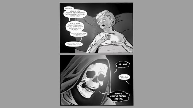 Death comforts a dying woman, and what she says STUNS him! This comic is our first Microfaun Original!! Art by Ariel Iacci https://www.instagram.com/arieliacci/?hl=en Writing and Story-boarding by Reece Cowan Cast: Brian Jeffords as Death - Twitter @BPJeffords Bell Heart as Doctor - Twitter @bellbellbell51 Reece Cowan as Grandmother Written, Directed and Edited by Reece Cowan If you liked it, please consider liking and subscribing! It pulls a lot of weight for small creators like me!! Thank you!! #webcomic #webcomics #comicdubs #cartoons #webtoon #webtooncanvas #2023 #medieval #fantasy #comics #comicdubs #comic #unexpected #fantasy #cute #cuteanimals #animals #adorable #pets #cartoon #comicdub #webcomics #webcomic #wholesome #sad #emotional #moving #reaper #death #life #love #death #afterlife #wholesome #feels #lifeanddeath