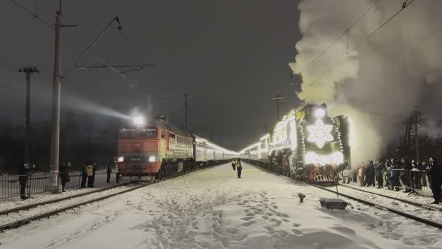 Паровозы "Генерал" П36 - 0027, 0110 и 0120 в окрасе "Поезд Деда Мороза" (Приписаны к депо ТЧЭ-18 Имени Ильича Московской железной дороги) и тепловоз ДМ62 - 1852 (Приписан к депо ТЧЭ-12 Санкт-Петербург-Финляндский Октябрьской железной дороги) с "Поездами Деда Мороза" №2024/2025. Станция Новый Петергоф Октябрьской железной дороги. Российская Федерация, Санкт-Петербург. 7.I.2025 Подписывайтесь на мою группу в VКонтакте: https://vk.com/transporttamer Подписывайтесь на мой YouTube канал: https://youtube.com/@transporttamer Подписывайтесь на мой канал на Яндекс Дзене: https://dzen.ru/transportinhistory