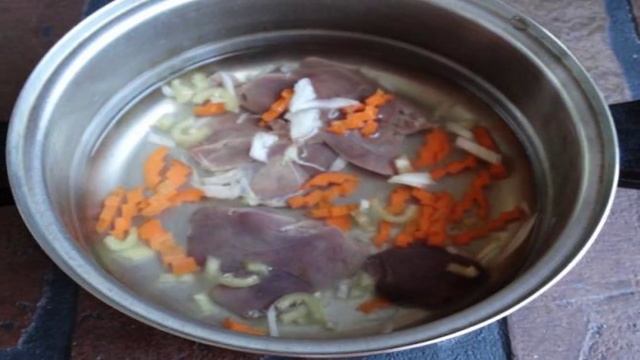 Печень тушеная с овощами и булгуром в сметане