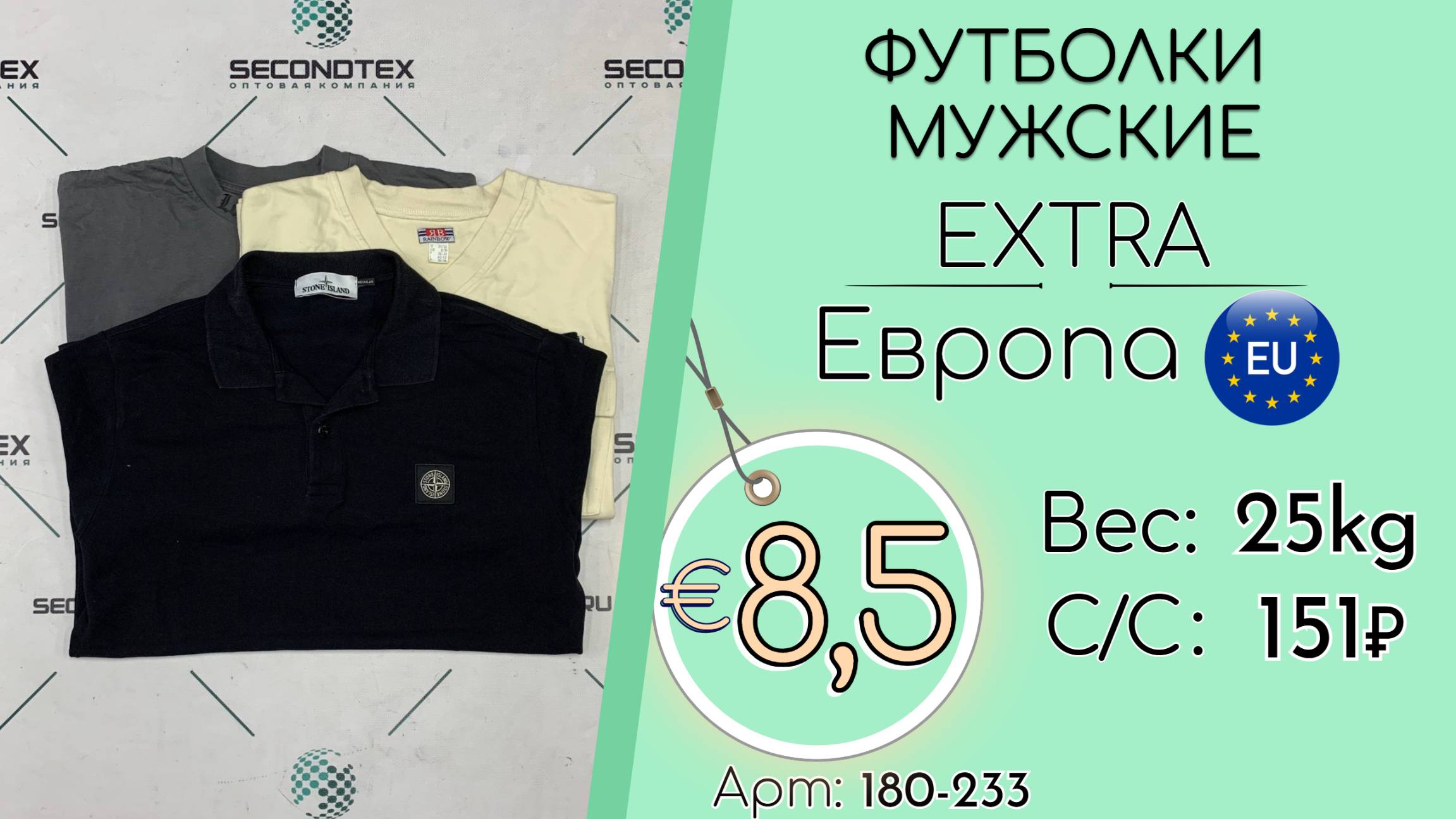 Страна: Европа Вес мешка: 25 кг Цена за кг: Евро 8,5 / Рубли 808 Цена за мешок: 20 188 руб. Себестоимость одной вещи: 151 руб. Кол-во штук: 134 шт. ____ 💰 Курс на дату съемки (04.08.2025): €1 = 95 Руб. (при наличных и безналичных платежах) 💳 €1 = 95 Руб. (при безналичной форме оплаты на р/с) Связаться с нами: +7(916)779-79-79 (WhatsApp, Telegram) Наш сайт: https://secondtex.ru Instagram: https://instagram.com/secondtex.opt Мы ВКонтакте: https://vk.com/secondtex