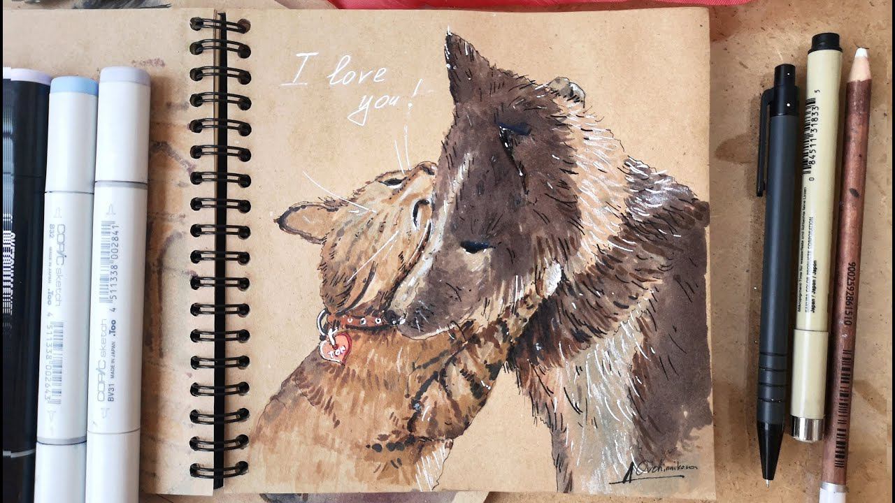Кот и пес. Мастер класс по спиртовым маркерам на крафтовой бумаге.