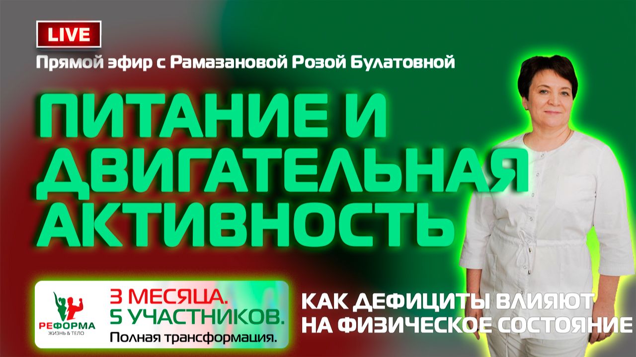 Запись эфира с Рамазановой Розой Булатовной, врачом-эндокринологом, нутрициологом, диетологом, специалистом интегративной медицины, и Гарифуллиной Альбиной Наилевной, коммерческим директором клиники «Институт здоровья и долголетия». 🎙Тема: Питание и двигательная активность Обсуждаем, можно ли скорректировать активность только питанием, нужны ли биологически активные вещества и хватает ли нам витаминов и минералов из обычного рациона. Отвечаем на вопросы подписчиков и участников. 01:17 Насколько питание влияет на нашу физическую активность? 03:32 Нужно ли завтракать? Когда? И что завтрак должен включать? 06:09 Кофе вместо завтрака 08:04 Путь к изменениям. С чего начать в 1 очередь: питание, анализы, физическая активность 11:32 Питьевой режим. Сколько и как пить? 16:21 Как много и в какое время лучше заниматься спортом по мнению врача. 18:56Биологически активные добавки. Необходимость их приёма. 22:40 Бездумный приём витаминов. Токсичное влияние. Как надо. 25:15 Обед и ужин. Взаимосвязь с прибавкой веса и качеством сна. 28:32 Здоровые перекусы. Правда о протеиновых батончиках. 30:52 Инсулин – гормон старения. Внешние признаки инсулинорезистентности. 34:37 Психологическое сопротивление 36:08 Каких результатов ожидать от 5 участников проекта Реформа? 37:50 Общие рекомендации от Рамазановой Розы Булатовны.