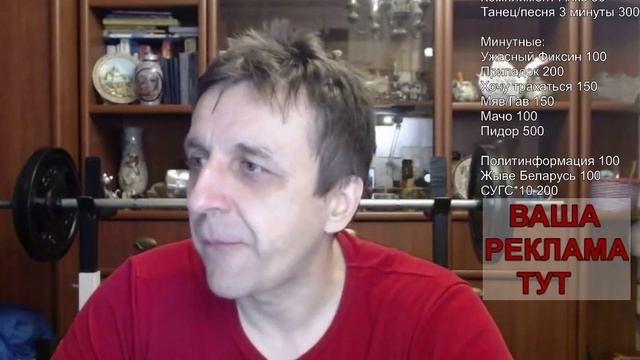 Донатьте мне в эфире тут: https://www.donationalerts.com/r/fixin Художник, когда он сытый, он добрее! Заходите на мой блог-сайт: https://fixinchik.ru ------------ Crazy-меню (в рублях): ------------ - Передать привет: 200 - Сделать Анке комплимент: 50 - Фиксо-танец: 300 (музыку заказываете вы, под ЛГБТ песни не танцую) до 3х минут - Фиксо-пение или караоке: 300 рублей до 3х минут - 10 приседаний: 200 - 20 прыжков на месте: 200 - Выпить полный стакан воды: 200 Сценки на минуту: - Изобразить ужасного Фиксина: 100 - Изобразить припадок: 200 - "Хочу трахаться": 150 - Мяуканье/гавканье: 150 - Изобразить мачо: 100 - Изобразить пидора: 500 Иностранные языки: - Рассказ о себе на английском 3 мин: 300 - Любая короткая сказка на английском: 300 - Следующие 5 минут эфира на белорусском: 400 Политика: - Патриотическая политинформация на минуту: 100 - "Жыве Беларусь" 10 раз подряд: 100 - СУГС 10 раз подряд : 200, с прыжками: 300 Алкоголь: - 0.5 вина: 3000 (заказывать заранее) - 0.33 пива: 2000 (заказывать заранее) - Стриптиз до трусов: 200 Реклама: - Ваш баннер на весь эфир в углу экрана: 500 - Устное объявление до 1 минуты: 200 - Озвучка мною любого текста, присланного через Donation Alerts в рамках УК/АК (без оскорблений) до 1 минуты 1000 - Ваш логотип на моей майке (распечатан на бумаге и приклеен) - 500 за весь эфир - Ваш логотип на моей шапке (распечатан на бумаге и приклеен) - 1000 за весь эфир