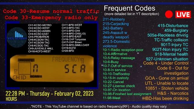 Companion stream for watching local stringers and/or PulsePoint - 12 hour rewind for re-viewing purposes - Frequency List - https://tinyurl.com/KCBfreq Police Codes PDF - https://tinyurl.com/KCBcodes Scanner Model - Bearcat 350C https://tinyurl.com/KCB350 Antenna - HG Scanner https://tinyurl.com/KCBbaseantenna Budget Scanner - Baofeng UV5R https://tinyurl.com/KCBUV5 Budget Antenna - https://tinyurl.com/ABBREE771