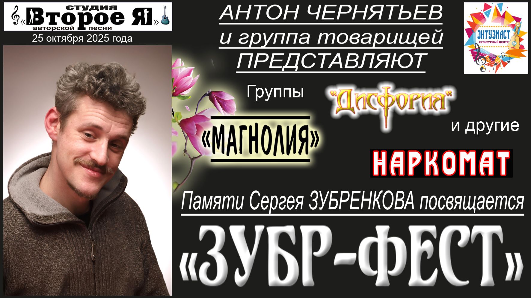 Участники: Антон Чернятьев и группа «Магнолия» в разных составах, группа «Наркомат», группа «Дисфория», Антон Андрухович, Николай Волынский, Алексей Коровин, Александр Галаганов, Элина и Владимир Гочуа, Константин Дубинин, Сарра Атэх Свобода, Алексей Кудрявый и многие другие. Продолжительность – 4 часа 51 минута. Культурный центр ТСЖ «Энтузиаст» под председательством Платона Толстикова: Москва, Шоссе Энтузиастов, дом 10/2 (метро «Площадь Ильича», «Римская»). 25 октября 2025 года.