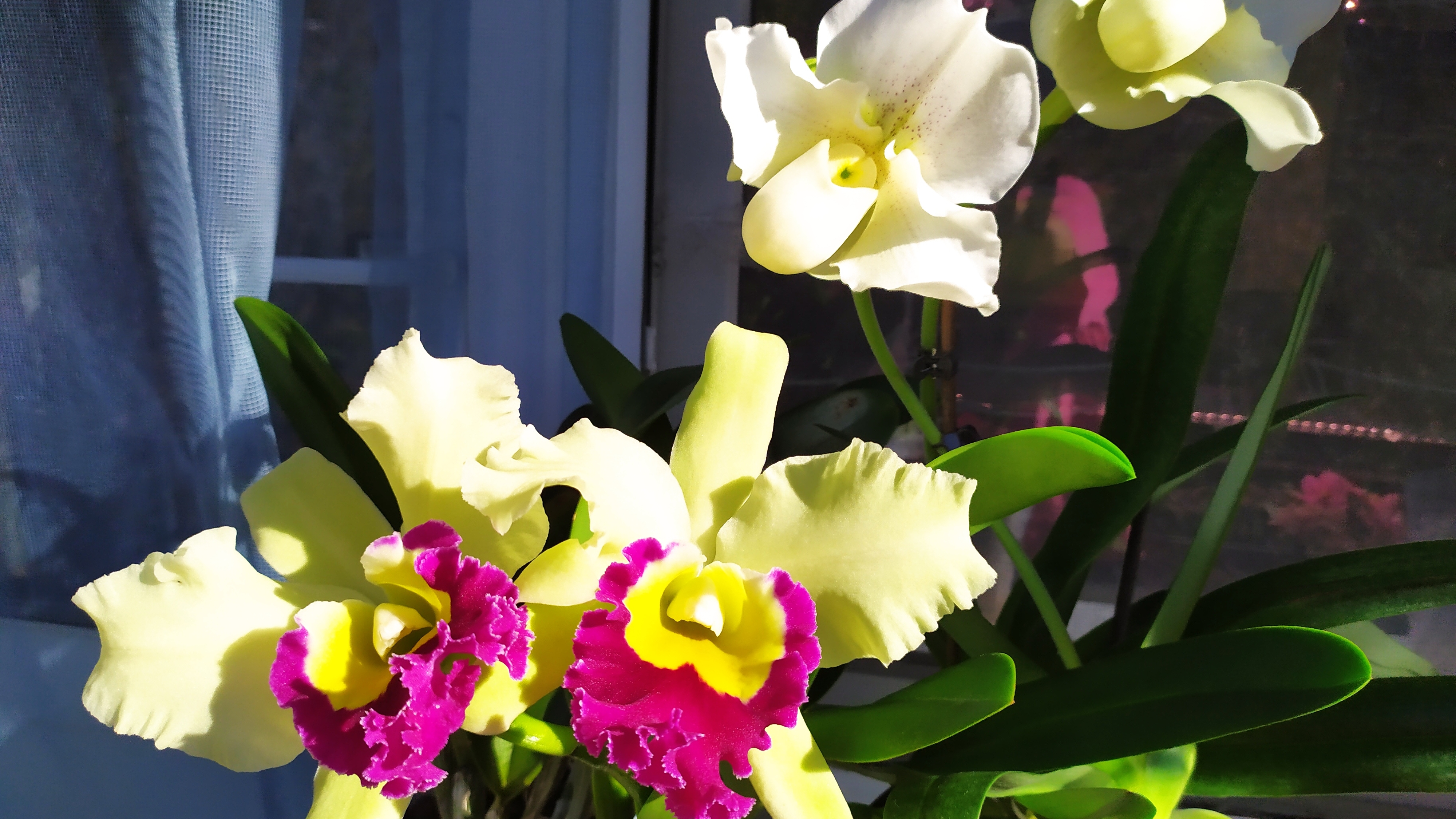 Домашние цветение орхидей. Каттлея и пафиопедилум White Lady.