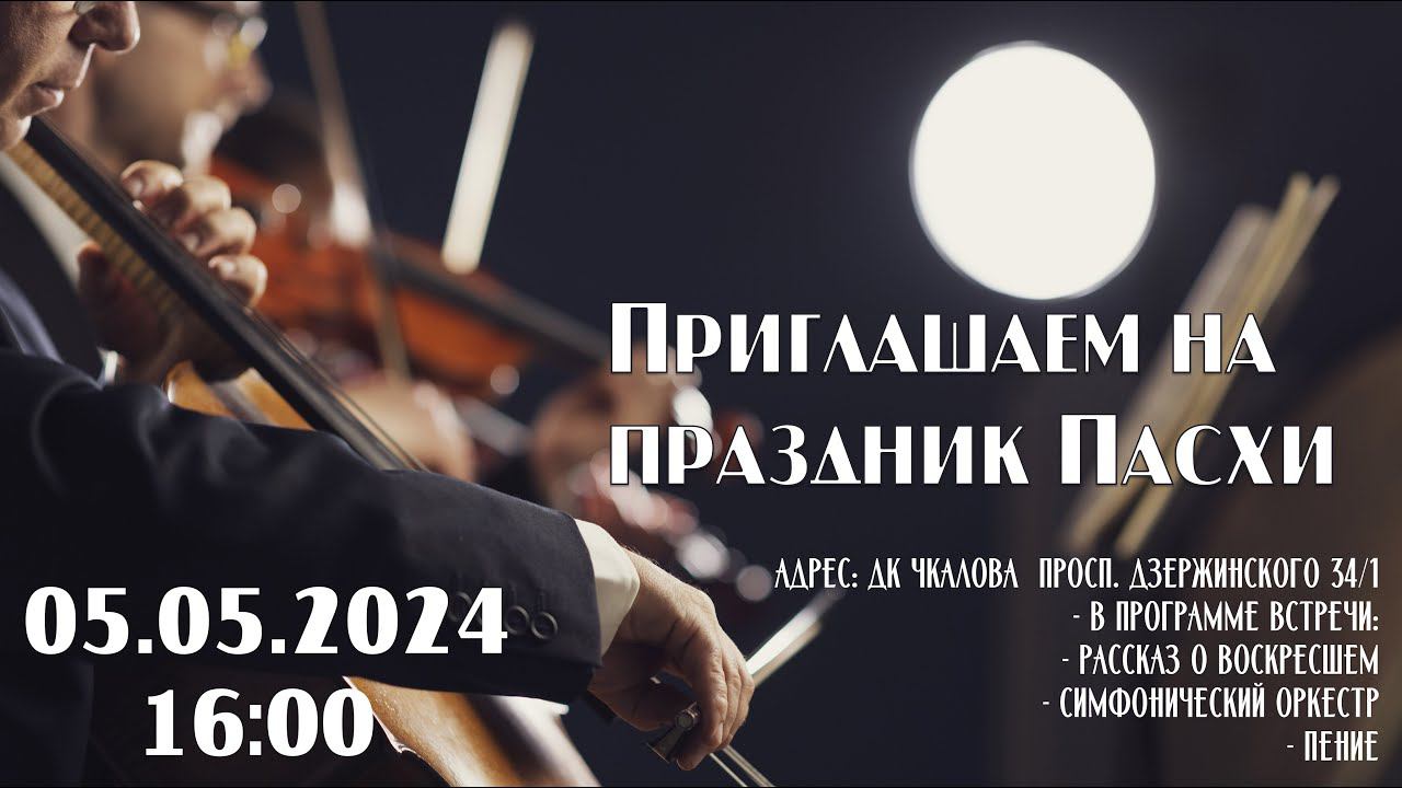 Пасхальная встреча в г. Новосибирске Дата: 05.05.2024 Адрес: ДК Чкалова просп Дзержинского 34/1 Время: 16:00 В программе встречи: ⁃ рассказ о Воскресшем ⁃ Симфонический оркестр ⁃ пение