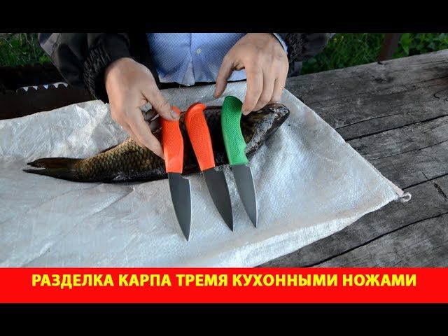 Разделка карпа тремя кухонными ножами с одинаковыми клинками и разными рукоятями