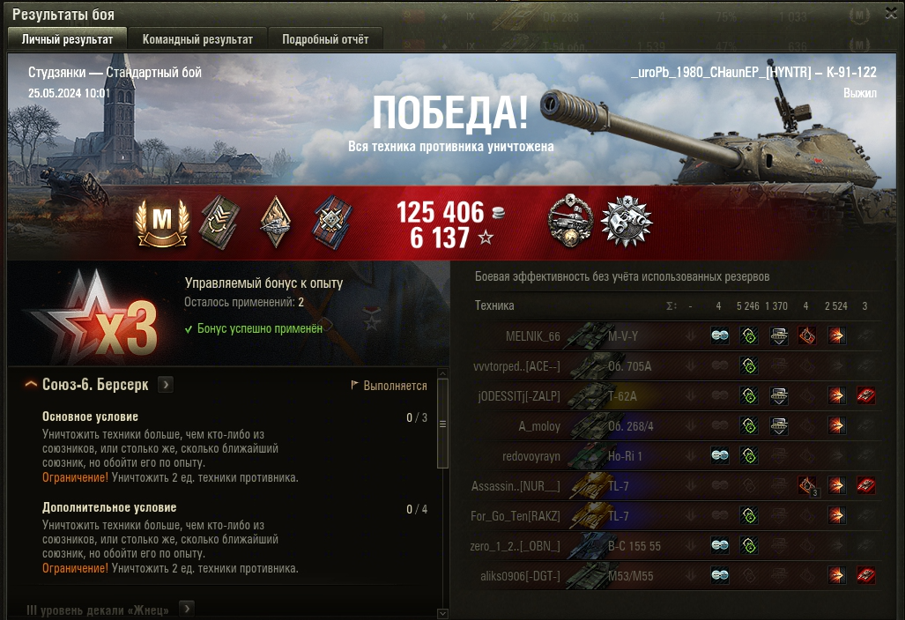 СТУДЗЯНКИ МАСТЕР на К-91-122 ОПЫТ: 1341 СУММАРНЫЙ УРОН: 7770 медаль ДОЗОРНЫЙ