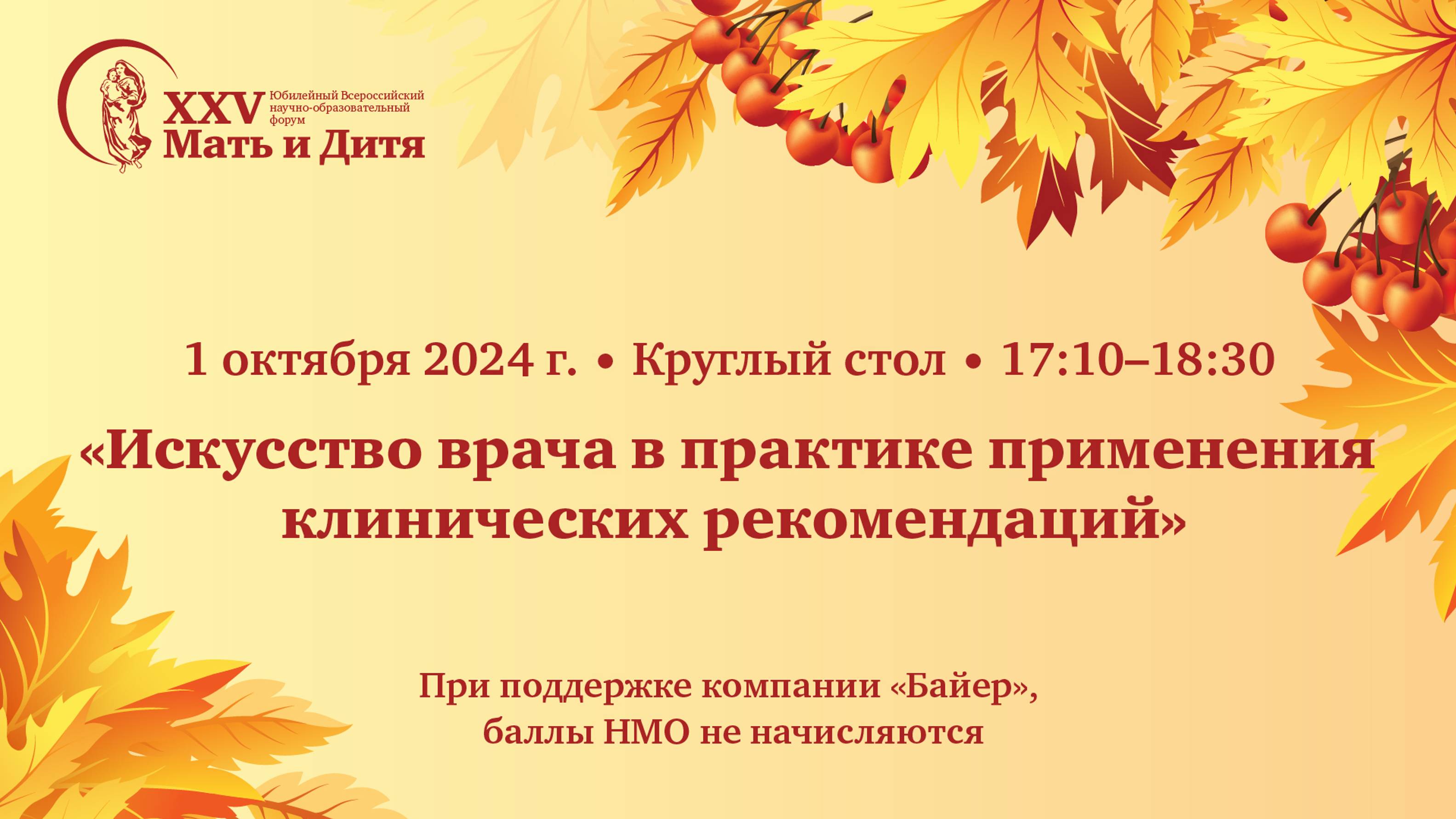 Председатели: Баранов И.И., Ярмолинская М.И., Тетруашвили Н.К., Алиева Д.А., Святова Г.С. При поддержке компании «Байер» В рамках XXV Юбилейного Всероссийского научно-образовательного форума «Мать и Дитя» 1–3 октября 2024 года Официальный сайт форума: https://mother-child.ru Программа: https://mother-child.ru/moscow/program.html Telegram: https://t.me/mediexpo