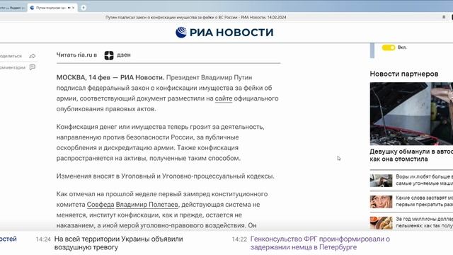 Путин подписал закон о конфискации имущества за фейки о ВС России - РИА Новости, 14.02.2024 — Яндекс