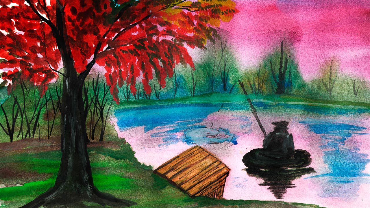 Рисуем рыбака акварелью. Рисуем пейзаж. Рисуем осенний пейзаж легко. Осень красками.