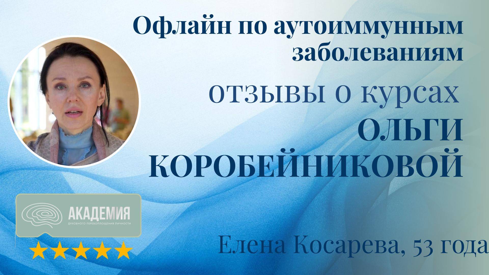 Отзывы о курсе Ольги Коробейниковой: "Офлайн по аутоиммунным заболеваниям" 97. Елена Косарева, 53 года - Курсы: Офлайн по аутоиммунным заболеваниям Елена отмечает, что благодаря курсу у неё возникло чувство, что её жизнь только начинается. Она благодарна Ольге, как человеку, который помог ей "родиться" заново в этой жизни. - Результат Курс подарил Елене ощущение начала новой жизни, наполненной смыслом и энергией. Отзывы Елены показывают, что курсы Ольги Коробейниковой помогают участникам обрести новое восприятие себя и начать свой жизненный путь с обновлённой силой и вдохновением.