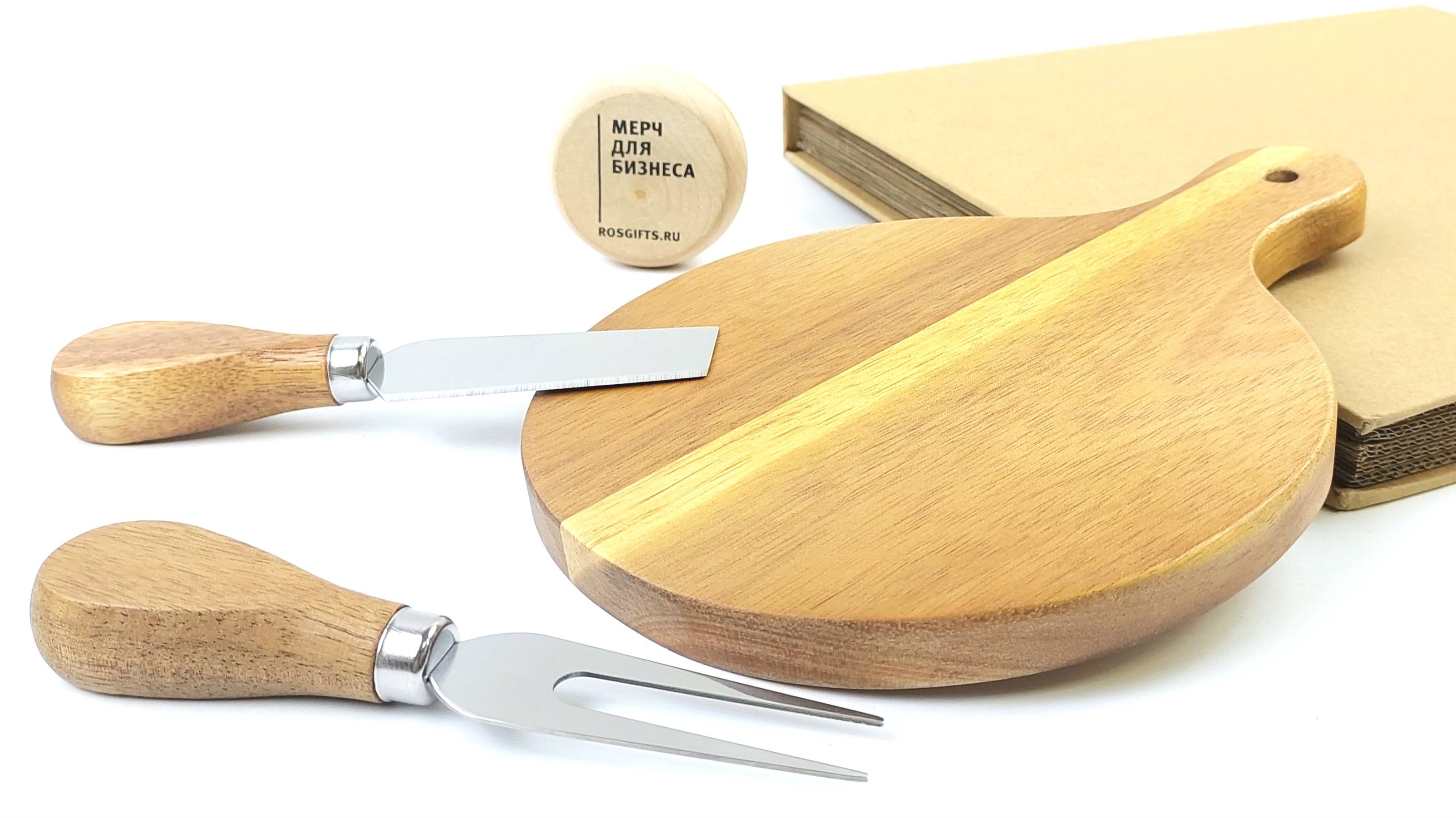 Набор для сыра: круглая доска с ручкой и два инструмента в комплекте - нож для мягкого сыра и вилка. Лезвия ножей выполнены из высококачественной нержавеющей стали. Доска выполнена из экологически чистого и прочного материала — древесины акации. Она обладает высокой твердостью, водоотталкивающими свойствами и не впитывает запахи. Набор для сыра пригодится как для нарезки, так и для сервировки. Размеры изделий доска: D=14,5см, L=20,7см, нож: L=12,8см, вилка: L=12,5см. Индивидуальная упаковка - коробка из крафтового картона с ложементом. Оптовый заказ от 20 наборов цены по ссылке https://rekonagrand.ru/goods/33601 в каталоге представлена различные наборы для сыра https://rekonagrand.ru/catalog/nabory-dlya-syra Различная сувенирная продукция в Москве со склада и под заказ https://rekonagrand.ru/catalog Большой выбор, хорошие остатки, быстрая отгрузка. Нанесение логотипов от 3-5 дней. Примеры нанесения в портфолио https://rekonagrand.ru/catalog/portfolio