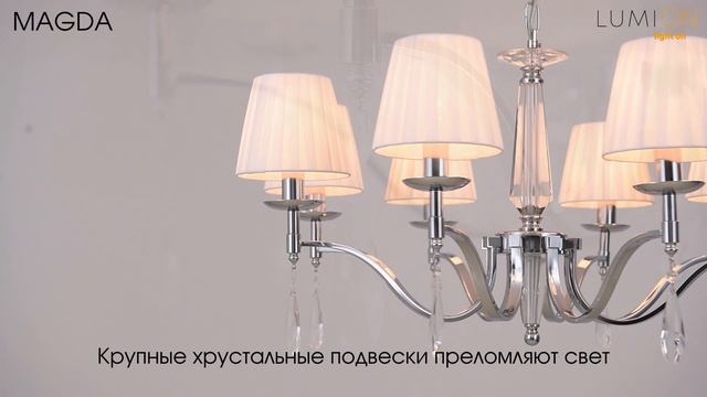 Центральный декоративный элемент линии MAGDA изготовлен из чистейшего хрусталя. Крупные хрустальные подвески преломляют свет и горят мириадами разноцветных искр. Высокие подсвечники, увенчанные традиционными классическими белыми абажурами, добавляют модели торжественности и статусности.