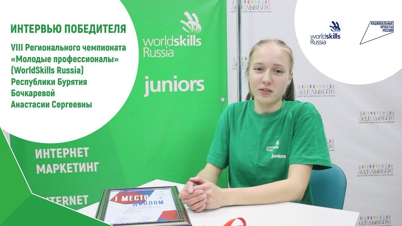 ♀Интервью победителя VIII Регионального чемпионата «Молодые профессионалы» (WorldSkills Russia) Республики Бурятия по компетенции интернет-маркетинг (юниоры) воспитанницы ЦДО «Эдельвейс» Бочкаревой Анастасии Сергеевны (МАОУ СОШ № 7) Желаем удачи Насте на отборочных соревнованиях для участия в финале X Национального чемпионата «Молодые профессионалы» (WorldSkills Russia)!