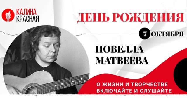 Вся информация на нашем официальном сайте: https://kalina.fm/ Подписывайся на группу «Калины Красной» ВКонтакте: https://vk.com/kalinafm Подписывайся на группу «Калины Красной» в Одноклассниках: https://ok.ru/group/55381208596598 Подписывайся на канал «Калины Красной» в Telegram: https://t.me/fm_kalina Подписывайся на группу «Калины Красной» в Дзен: https://dzen.ru/kalinakrasnaya #новелламатвеева #бард #авторскаямузыка #гитара #поэзия #девушкаизхарчевни