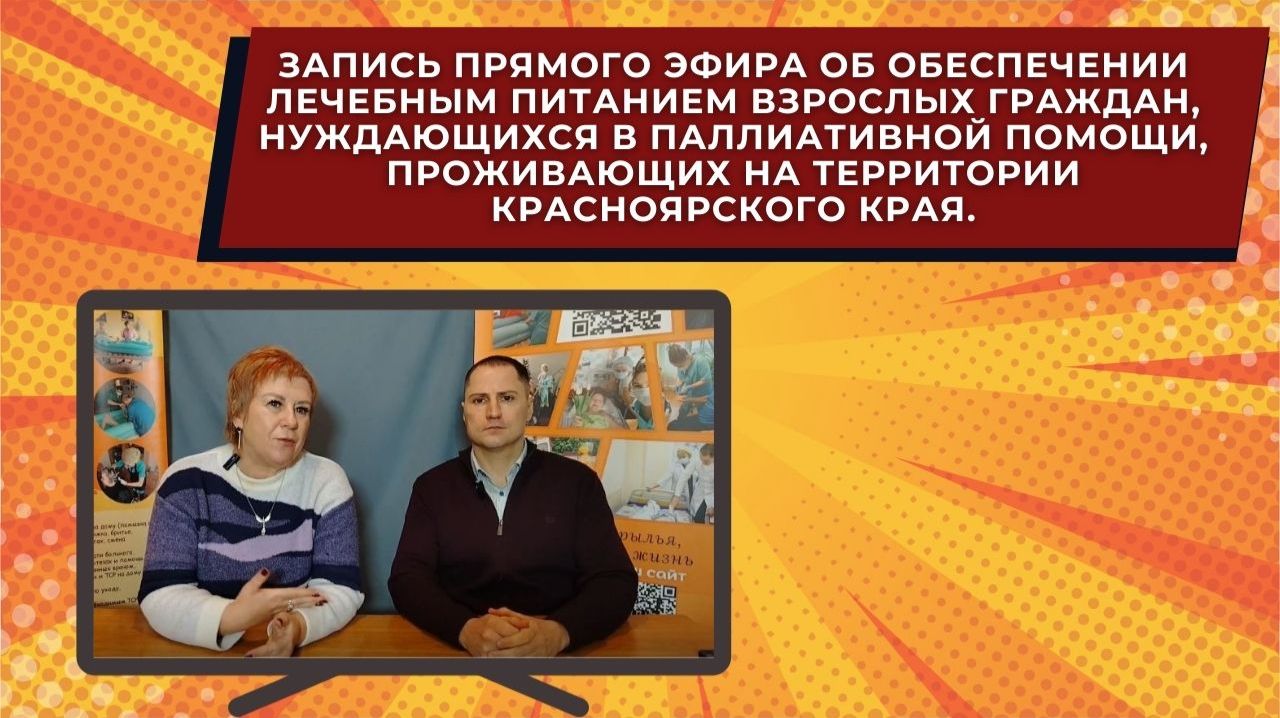 ЗАЧЕМ, КОМУ И КАК? Запись прямого эфира об обеспечении лечебным питанием взрослых граждан, нуждающихся в паллиативной помощи, проживающих на территории Красноярского края. Министрество здравоохранения Красноярского края закупило достаточное количество лечебного питания. Для его получения бесплатно необходимо: 1) чтобы пациент входил в реестр паллиативных больных Красноярского края 2) получить рецепт либо у терапевта, который ведет этого пациента, либо у врача паллиативной помощи. Показанием к применению лечебного питания является - потеря веса у больного. В таких случаях, обычная пища, даже протертая, не усваивается и помочь организму может именно лечебное питание. Если вашему близкому нужно лечебное питание. но он не входит в регистр паллиативных больных Красноярского края, нужно обратиться к терапевту с внесением его туда. Срок внесения в регистр паллиативных больных Красноярского края по решению врачебной комиссии - 3 суток. Если вам отказывают, терапевт не значает лечебное питание, не получается внести больного в регистр или аптеки задерживают предоставление этого питания по рецепту, вы можете обратиться в координационный центр паллиативной помощи по Красноярском краю по телефонам: 8(391)266-16-76 и 8(391)266-16-75 Красноярский край вошел в пилот по обесиечению лечебным питанием граждан, нуждающихся в паллиативной помощи и онкопациентов, питание закуплено, но пока очень маленький запрос, хотя пациентов, бысто теряющих вес в результате течения болезни, очень много, мы сами видим это по своим благополучателям. Передайте эту информацию своим близким и коллегам, у кого на руках есть тяжелобольные родственники.