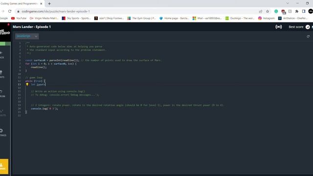 Using a straightforward condition, this puzzle shows me how to compare values. The spaceship must be securely landed on the platform in order to complete this challenge. EXPLANATION OF CODE: 1) The user's input is retrieved in the first two lines of the code. The first line specifically returns the surfaceN integer value, which is the number of points used to represent the surface of Mars. The user's real input is not used in the second line's loop, which iterates surfaceN times while retrieving more input from them. 2) The primary game loop is represented by the while loop. Until the game is finished or the software is stopped, it will keep running endlessly. The program reads user input and processes it for each iteration of the loop. 3) The third line inside the while loop retrieves input from the user, splits it into an array called inputs, and assigns the fourth value of that array to a variable called vSpeed, which represents the vertical speed of the spacecraft. 4) In accordance with the value of vSpeed, the following few lines of code establish the power and angle values. Namely, if vSpeed is less than or equal to -40, the power is set to 4, and the angle is set to 0. The default setting for power and angle is 0. 5) The last line of the code outputs the angle and power values that will be used to steer the spacecraft during the current iteration of the game loop. #codingame #javascript #marslander #condition #puzzle #easy #values #compare #spaceship #landed #platform