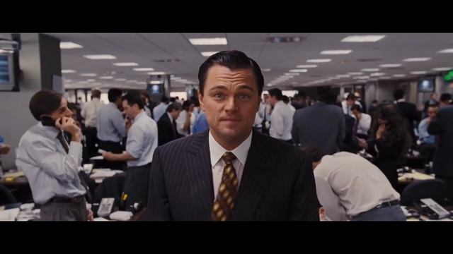 Момент из фильма волк с уолл стрит леонардо ди каприо в костюме в офисе говорит спрашивает