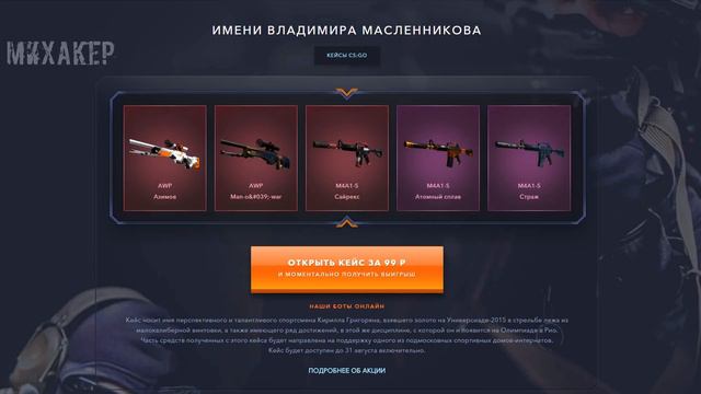 ► Открывай кейс Михакера и принимай участие в розыгрыше на 40000 рублей: https://goo.gl/S5NeCv ► Лучший сайт с кейсами CS:GO https://goo.gl/1Gtr4X ► Купон на бонусы при пополнении баланса: MUXAKEPV1239 Реклама на канале Михакера https://vk.com/topic-62124782_29734866 Открываем кейсы со скинами из игры CS:GO (Counter Strike: Global Offensive). Канал Михакера: https://www.youtube.com/user/Muxakep Паблик Вконтакте: https://vk.com/muxakepvideo Видео: https://youtu.be/qzP9ubp-jrQ Друзья в этом видео: ► Andrey Whitily https://goo.gl/3ajVjY Привет всем! Я Михакер. И это мой канал. Я делаю переводы и озвучиваю смешные видео с таких зарубежных каналов, как VanossGaming, H2ODelirious, KYRSpeedy и других. Также у меня вы найдете летсплеи (Letsplays), прохождения, обзоры и стримы с моими друзьями. Ставьте "палец вверх" за понравившиеся ролики и подписывайтесь на наш канал!