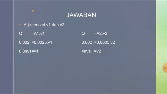 Pipa venturi dialiri air dengan debit 2liter/s. Luas penampang A1=25cm², dan A2=5cm². Jika massa jenis air 1g/cm³, massa jenis air raksa 13,6g/cm³, dan percepatan gravitasi=10m/s², maka hitunglah: a.) Kecepatan aliran air pada penampang 1 dan 2, b.) Beda tekanan di titik 1 dan 2, dan c.) Selisih permukaan air raksa pada manometer