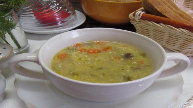 Пшеничный суп с тыквой и консервированным горошком