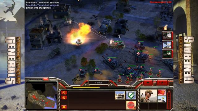 Wir sind immer noch im Großangriff gegen die GBA in dieser Mission. So rücken wir schön langsam durch die Stadt hin durch. Wir produzieren auch gleich wiederein paar Panzer um unseren Trupp wieder aufzustocken. So schalten wir nach und nach einen Gegner nach dem anderen aus. Mittlerweile sehen wir auch schon die Sprengfallen und können die nach und nach zerlegen. Mit der neuen Truppe suchen wir mal ein bisschen Anschluss zum Kampferfahrenen Trupp um die GBA vernichten zu zerschlagen. So machen wir nach und nach die Letzte Basis der GBA kaputt und gewinnen so diese Mission.
