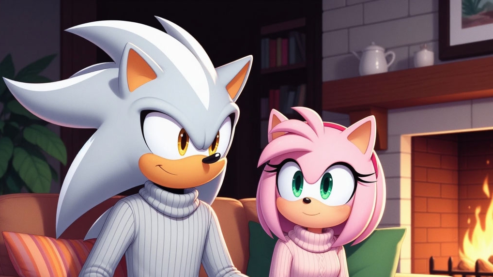 Тандер и Эми возле камина.