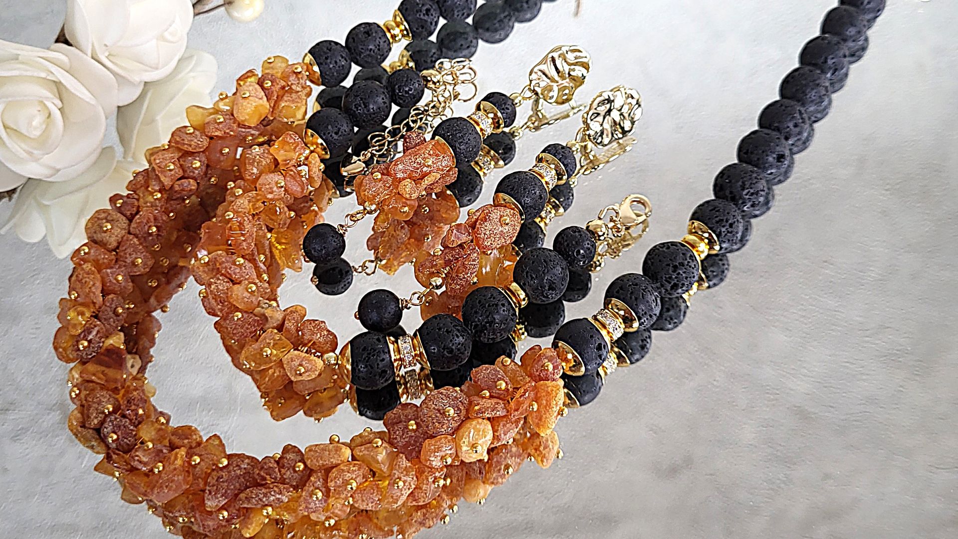 Комплект украшений из янтаря, лавового камня