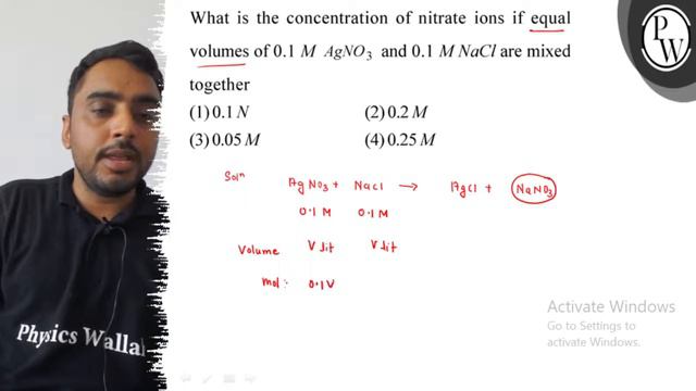 What is the concentration of nitrate ions if equal volumes of 0.1 MAgNO 3 and 0.1 MNaCl are mixed together (1) 0.1 N (2) 0.2 M (3) 0.05 M (4) 0.25 M Activate Windows lal Go to Settings to 📲PW App Link - https://bit.ly/PW_APP 🌐PW Website - https://bit.ly/PW_APP 📌 PHYSICS WALLAH OTHER CHANNELS : 🌐 PhysicsWallah -Alakh Pandey: https://youtube.com/@PhysicsWallah 🌐 Alakh Pandey: https://youtube.com/@alakhpandey1414 🌐 JEE Wallah: https://youtube.com/@jee_wallah 🌐 Competition Wallah: https://youtube.com/@competitionwallah 🌐 PW Foundation: https://youtube.com/c/PhysicsWallahFoundation 🌐 NCERT Wallah : https://www.youtube.com/channel/UC8zCnnfhz-dvIpVdZ1CheuA 🌐 Defence Wallah-NDA: https://youtube.com/channel/UC8OCoGX9tmMneOzIFUTWq2Q 🌐 PhysicsWallah English: https://youtube.com/@EnglishPW 🌐 PW Vidyapeeth: https://youtube.com/@VidyapeethPW 🌐 Commerce Wallah by PW: https://youtube.com/@commercewallahpw 🌐 CA Wallah bt PW: https://www.youtube.com/channel/UC2amkJX5zDyQJ0mDajAWRSA 🌐 PW Sarkari Exam: https://youtube.com/@PWSarkariExams 🌐 PW - Hindi Medium: https://youtube.com/@physicswallahhindimedium 🌐 PW Bangla: https://youtube.com/@pwbangla 🌐 PW Maharashtra: https://youtube.com/@PWMaharashtra 🌐 PW Telugu: https://youtube.com/@PWTelugu 🌐 PW Kannada: https://youtube.com/@PWKannada 🌐 PW Gujarati: https://youtube.com/@PWGujarati 🌐 PW Facts: https://youtube.com/@pwfacts 🌐 PW Insiders: https://youtube.com/channel/UCHMWQFr9Nwo3wJsAap2Wnfw 🌐 PW Little Champs: https://youtube.com/@pwlittlechamps 🌐 PW Pathshala: https://youtube.com/channel/UCcXUY9NSMyYbkOvUD97CUmA 🌐 Banking Wallah : https://www.youtube.com/channel/UCg5_K50hLTKerLkSE7I1yWQ 🌐 SSC Wallah : https://www.youtube.com/channel/UCcaEVV7A47J4k9GFcqOOYkg 🌐 JEE Challengers by PW : https://www.youtube.com/channel/UCyf71tWV2abeN-l_UKiJ-5g 🌐 UPSC Wallah : https://www.youtube.com/channel/UCqOy6oOu6RPJNHYQ8f_Ybvg 🌐 UPSC Wallah हिन्दी : https://www.youtube.com/channel/UCmrP-DYdZuThp8AO9lnnwNw 🌐 GATE Wallah : https://www.youtube.com/channel/UC9PoSJoftLvEnXT-PtQ5Wtw 🌐 GATE Wallah - EC,EE & CS : https://www.youtube.com/channel/UCuGWIkiNaWjsCqybgxGuxfg 🌐 GATE Wallah - ME, CE & XE : https://www.youtube.com/channel/UCGrrw9x3_B_fItUIBMvqAUw 🌐 GATE English : https://www.youtube.com/channel/UCOsV75fSUr8gnMbhx-Qh3Lg 🌐 College Wallah : https://www.youtube.com/channel/UCDrf0V4fcBr5FlCtKwvpfwA 🌐 PW IIT JAM & CSIR NET : https://www.youtube.com/channel/UCuj28Zll58sztDqLiDhzgtQ 🌐 MBA Wallah : https://www.youtube.com/channel/UCWWEvCschv0T0rtou4VaKGw 🌐 Teaching Wallah : https://www.youtube.com/channel/UCUzqJZOkCejFoc5eqWWA9Eg 📌 PHYSICS WALLAH SOCIAL MEDIA PROFILES : 🌐 Telegram : https://t.me/pwjeewallah 🌐 Facebook : https://www.facebook.com/physicswallah 🌐 Instagram : https://www.instagram.com/pwjee_wallah/?hl=en 🌐 Twitter : https://twitter.com/physics__wallah 🌐 Linkedin : https://www.linkedin.com/company/78087354/admin/ 📌 For any queries or complaints Visit : https://bit.ly/PW_Queries