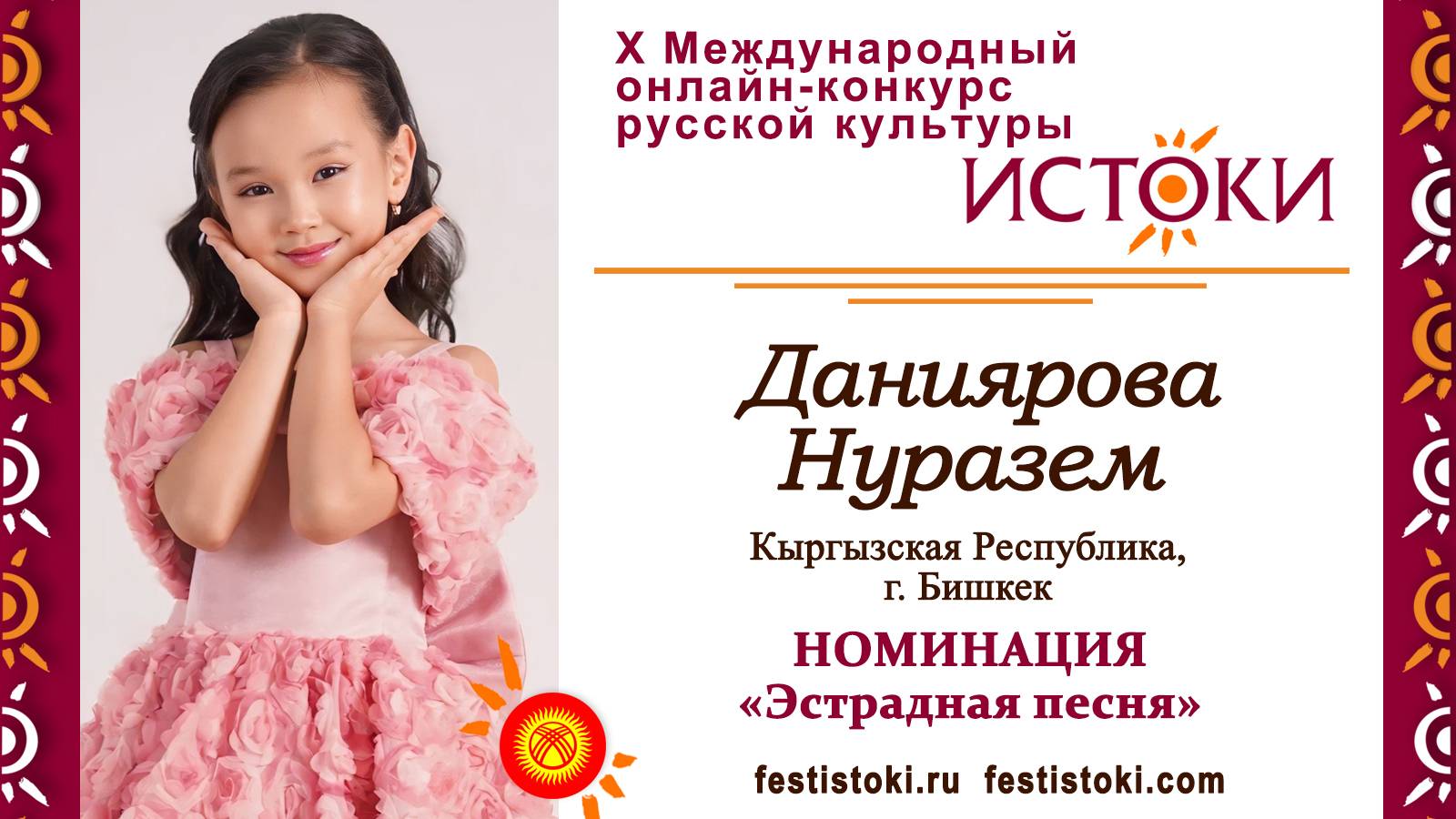 Участник Х Международного онлайн-конкурса русской культуры "Истоки". Номинация "Эстрадная песня". Песня "Волшебный цветок" из сказки "Шёлковая кисточка". Композитор Юрий Чичков, автор слов Михаил Пляцковский. Сайт: festistoki.ru / festistoki.com E-mail: festistoki@mail.ru