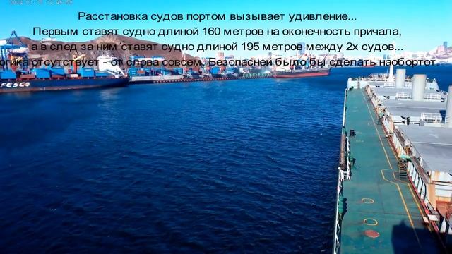 Лоцманская компания "Владлоцман". Расстановка судов, очерёдность постановки портом судов к причалу вызывает недоумение. Сначала порт ставит судно на оконечность причала, где ни чего не мешает швартовки а затем, сразу же ставят судно больших размеров между 2х судов ??? Безопасней было бы поставить суда на оборот.