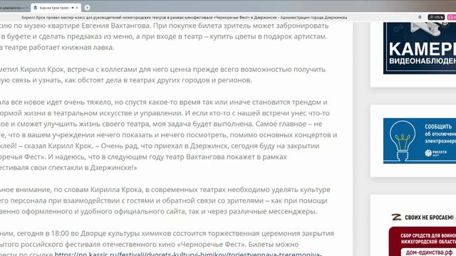 Кирилл Крок провел мастер-класс для руководителей нижегородских театров в рамках кинофестиваля «Черноречье Фест» в Дзержинске 25 февраля в рамках II Открытого российского фестиваля отечественного кино «Черноречье Фест» Дзержинск посетил директор театра имени Евгения Вахтангова, заслуженный работник культуры России, заслуженный деятель искусств России Кирилл Крок. Он встретился с руководителями театров Дзержинска и Нижегородской области и на примере одного из самых популярных театров страны поделился особенностями управления современным учреждением культуры. В числе участников встречу посетил глава города Дзержинска Иван Носков. «Билеты в театр имени Евгения Вахтангова нужно покупать сильно заранее – это, на мой взгляд, основной показатель работы всего театрального коллектива и каждого работника. Это значит, зрители хотят возвращаться в театр – не только ради актеров, но и ради общей атмосферы театра. Очень точно сказал Кирилл Игоревич: если зрителю нахамили при входе или в гардеробе, не спасет даже Сергей Маковецкий на сцене. Многие приемы и подходы, о которых шла речь на встрече, нашим театрам и всем учреждениям культуры области обязательно нужно взять на заметку и продумать, как их можно применить у себя. Это не фантастика, а реалии сегодняшнего дня», – отметил глава города Дзержинска Иван Носков. Акцент в своем выступлении Кирилл Крок сделал на особенностях современного театрального менеджмента. Он рассказал о том, какие возможности сегодня есть для зрителей в театре имени Евгения Вахтангова и какие составляющие влияют на его общую атмосферу. Так, помимо спектаклей, гости могут посетить одну из трех экскурсий: об истории театра и великих вахтанговцах, о театральном закулисье и экскурсию по музею-квартире Евгения Вахтангова. При покупке билета зритель может забронировать столик в буфете и сделать предзаказ из меню, а при входе в театр – купить цветы в подарок артистам. Также в театре работает книжная лавка. Как отметил Кирилл Крок, встреча с коллегами для него ценна прежде всего возможностью получить обратную связь и узнать, как обстоят дела в театрах других городов и регионов. «Сначала все новое идет очень тяжело, но спустя какое-то время так или иначе становится трендом и даже нормой жизни в театральном искусстве и управлении. И если кто-то с нашей встречи унес что-то полезное и сможет улучшить жизнь своего театра, моя задача будет выполнена. Самое главное – не думайте, что в вашем учреждении нечего показать и нечего посмотреть, помимо основных концертов и спектаклей! – сказал Кирилл Крок. – Очень рад, что приехал в Дзержинск, сегодня буду на закрытии «Черноречья Фест». И надеюсь, что в следующем году театр Вахтангова покажет в рамках кинофестиваля свои спектакли в Дзержинске!» Отдельное внимание, по словам Кирилла Крока, в современных театрах необходимо уделять культуре рабочего персонала при взаимодействии с гостями и обратной связи со зрителями – как при помощи качественно оформленного и удобного официального сайта, так и через различные мессенджеры. Напомним, сегодня в 18:00 во Дворце культуры химиков состоится торжественная церемония закрытия II Открытого российского фестиваля отечественного кино «Черноречье Фест». Билеты можно приобрести по ссылке https://nn.kassir.ru/festivali/dvorets-kulturyi-himikov/torjestvennaya-tseremoniya-zakryit
