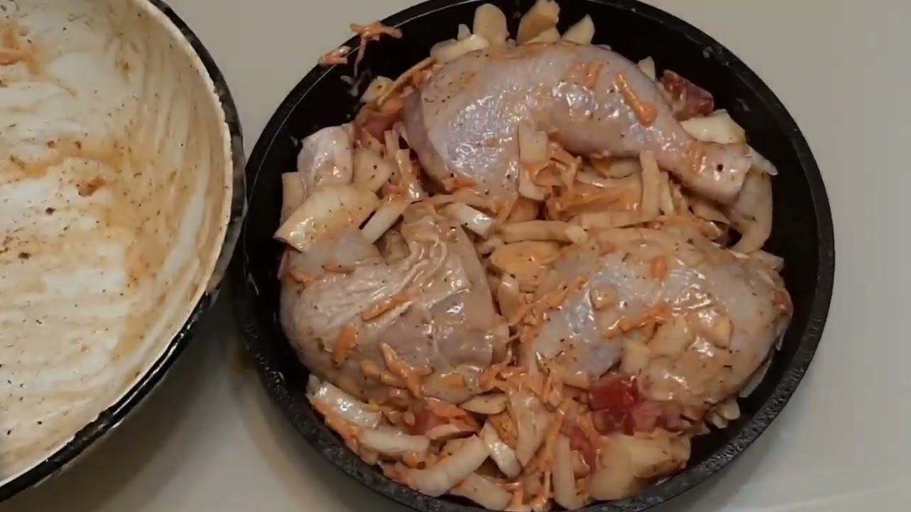 3 окорочка, 1 большая луковка (лука много не бывает) 1 морковка, 1 помидорина,1 чайная ложка соли, 1 чайная ложка приправы для мяса, 1 столовая ложка майонез или сметаны, 2 столовых ложки соевого соуса, 1 столовая ложка кетчупа, 1 чайная ложка горцы, 3 столовых ложки растительного масла. всё смешать дать постоять 30 минут и запекать в духовке 1 час при 180 градусах, затем снять фольгу или крышку , влить 0,5 стакана молока и поставит на 10 минут под гриль. Ужин готов. Приятного аппетита !!! Подпишись и лайкни !!!