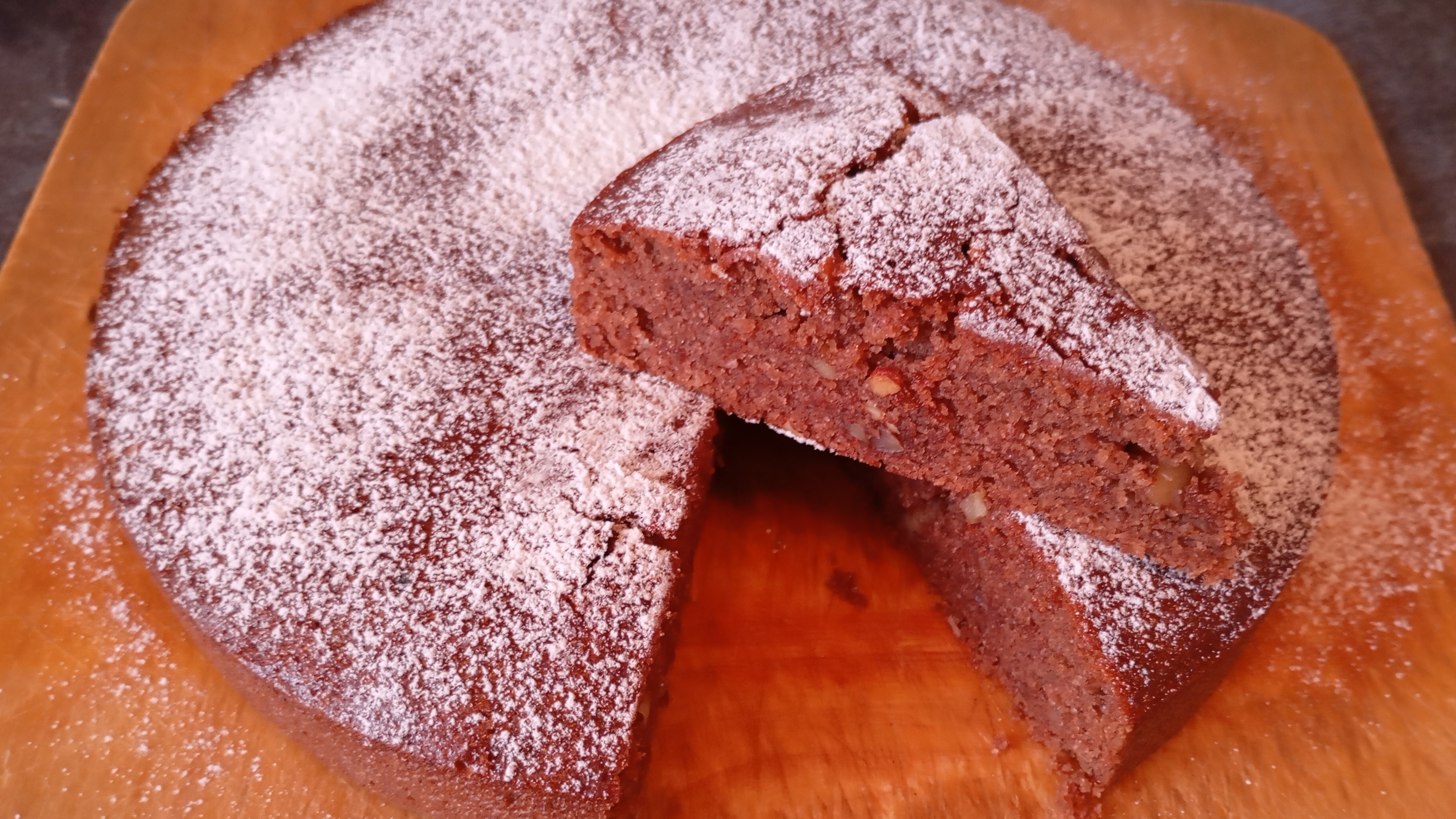 Ингредиенты: мука - 1 стакан манная мука - 1 стакан вода - 1 стакан сахар - 1 стакан масло растительное - 0,5 стакана корица молотая - 1 ч л. ванилин - 1 ч.л. разрыхлитель - 1,5 ч.л. какао порошок - 1 ст.л. орехи грецкие - 50 гр. сахарная пудра для обсыпки - 5 гр.