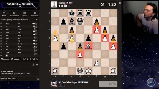 Друзья, всем привет. Партия со стрима, представляю вашему вниманию. Шахматы. Блиц 3+0 на chess.com. Если интересно, - подписывайтесь на канал, ставьте лайки, оставляйте комментарии. Поддержка через: DonationAlerts: https://www.donationalerts.com/r/onedebutplayer Бусти: https://boosty.to/onedebutplayer/donate Donatepay: https://new.donatepay.ru/@1272445
