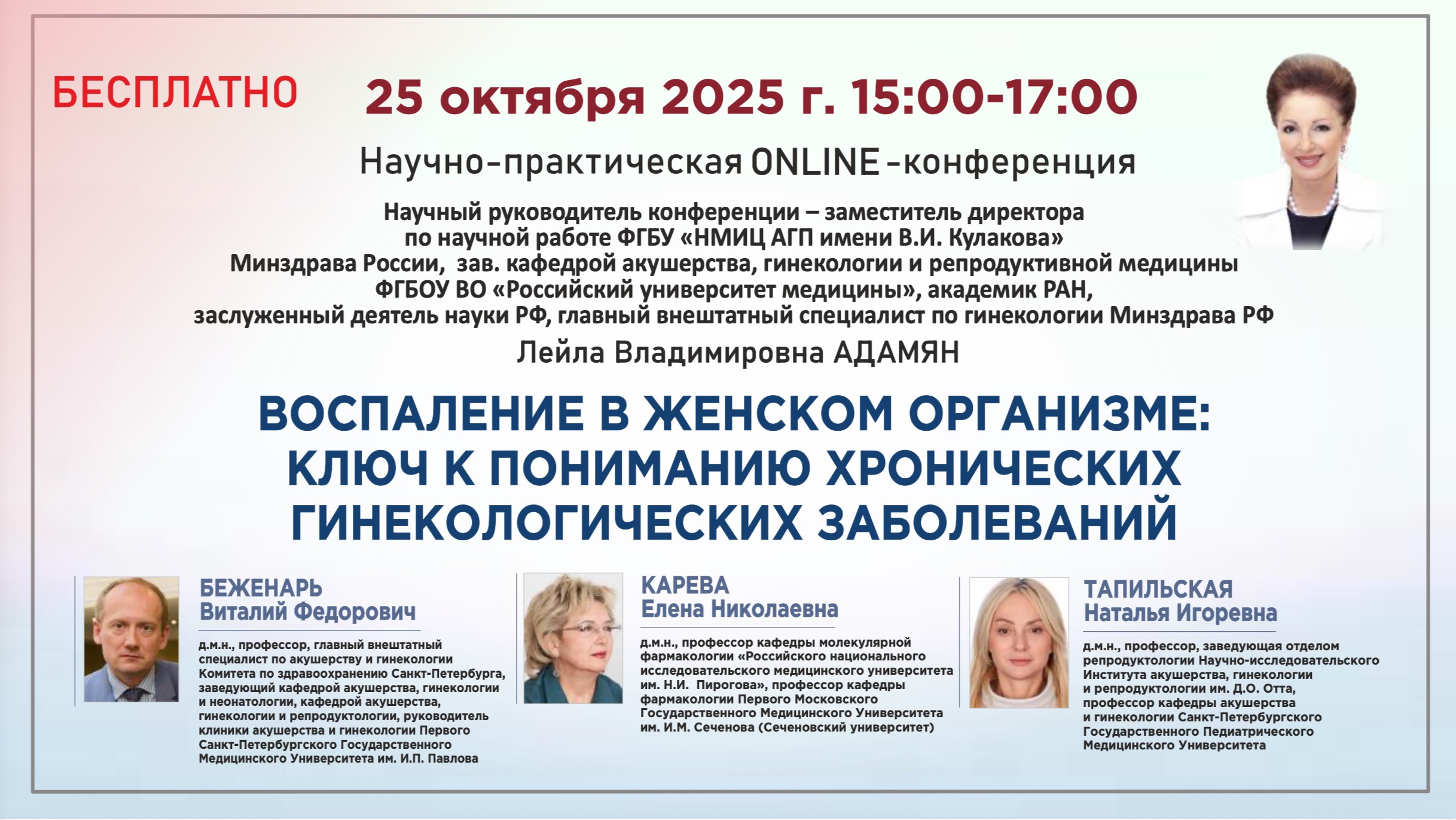 Научно-практическая онлайн конференция: ВОСПАЛЕНИЕ В ЖЕНСКОМ ОРГАНИЗМЕ: КЛЮЧ К ПОНИМАНИЮ ХРОНИЧЕСКИХ ГИНЕКОЛОГИЧЕСКИХ ЗАБОЛЕВАНИЙ За последние десятилетия взгляды на механизмы формирования спаек в малом тазу претерпели серьёзную эволюцию. От представления о спайках как простой механической преграде мы перешли к осознанию их как сложного многофакторного процесса, в основе которого лежат хроническое воспаление, иммунный дисбаланс и активация фиброгенеза. Согласно эпидемиологическим данным, спаечный процесс может развиваться у 80% женщин после перенесённых операций на органах малого таза, а у 20–30% именно он становится причиной трубно-перитонеального бесплодия. Ключевым триггером этой патологии является воспаление, источники которого могут быть различными. Эндометриоидные очаги выступают постоянным источником провоспалительных цитокинов (IL-1β, IL-6, TNF-α) и факторов роста (VEGF, TGF-β), поддерживая персистирующее воспаление и активируя фиброгенез. Не менее важную роль играет эндометрит, который нередко протекает малосимптомно или бессимптомно, поддерживая стойкий воспалительный фон и нарушая рецептивность эндометрия. Хроническое воспаление слизистой оболочки матки препятствует имплантации, повышает риск бесплодия и неудач ВРТ, а также способствует фиброгенезу и формированию спаечного процесса. В результате происходит усиление хронической тазовой боли и снижение репродуктивного потенциала женщины. Независимо от этиологического фактора, персистирующее воспаление запускает ангиогенез, нейрогенез, трансформацию фибробластов в миофибробласты и избыточный синтез коллагена. Итог — формирование спаек, нарушение анатомии малого таза, хронический болевой синдром, бесплодие и повышенный риск внематочной беременности. При эндометриозе вероятность развития спаек выше почти в два раза. Современные подходы к терапии всё чаще фокусируются не только на устранении последствий, но и на воздействии на ключевые звенья патогенеза — контроле воспаления, разрушении патологических структур и профилактике избыточного фиброза. Эволюция взглядов последних лет показала: именно раннее и целенаправленное вмешательство даёт возможность изменить течение заболевания и улучшить репродуктивные исходы. Научный руководитель конференции: АДАМЯН Лейла Владимировна Заместитель директора ФГБУ «НМИЦ акушерства, гинекологии и перинатологии имени В.И. Кулакова» Минздрава России, зав. кафедрой репродуктивной медицины и хирургии ФГБОУ ВО «Российский университет медицины», академик РАН, заслуженный деятель науки РФ, главный внештатный специалист по гинекологии Минздрава РФ Спикеры: БЕЖЕНАРЬ Виталий Федорович — д.м.н., профессор, главный внештатный специалист по акушерству и гинекологии Комитета по здравоохранению Санкт-Петербурга, заведующий кафедрой акушерства, гинекологии и неонатологии, кафедрой акушерства, гинекологии и репродуктологии, руководитель клиники акушерства и гинекологии Первого Санкт-Петербургского Государственного Медицинского Университета им. И.П. Павлова КАРЕВА Елена Николаевна — д.м.н., профессор кафедры молекулярной фармакологии «Российского национального исследовательского медицинского университета им. Н.И. Пирогова», профессор кафедры фармакологии Первого Московского Государственного Медицинского Ун