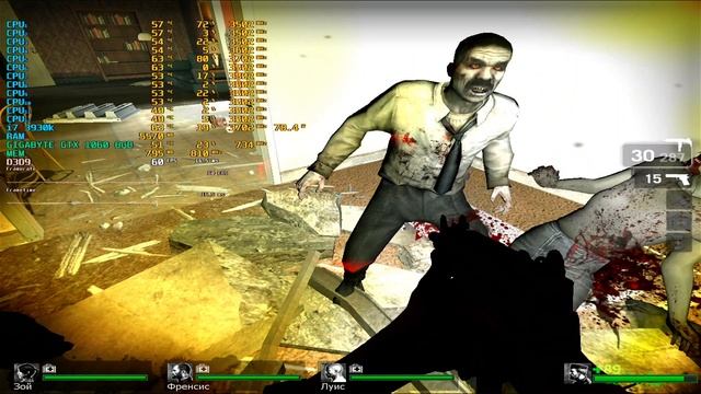 Game: Left 4 Dead Сomputer characteristics: Socket: LGA 2011 Motherboard: Asus Sabertooth X79 Processor: i7 3930K 3.20GHZ RAM: HYPER X 16GB DDR3-DIMM 1600 GPU: GeForce® Gigabyte GTX 1060 WINDFORCE OC 6G (rev. 1.0/1.1) ROM: HDD 500GB OS+HDD 2TB+ HDD 1TB Video in 1920x1080 resolution. Operating system: Windows 10 Pro