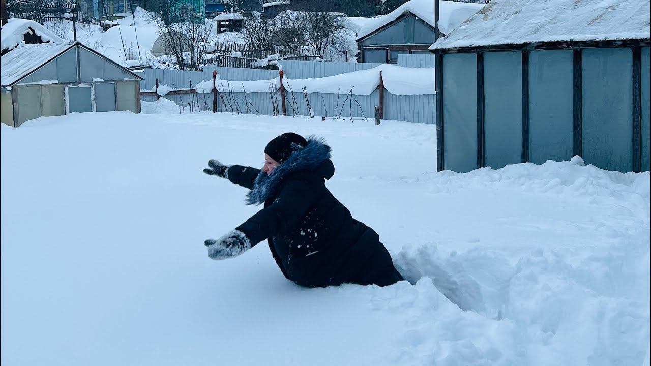 20 января. Убираю снег с крыши теплиц. Сугробы. Купание в снегу