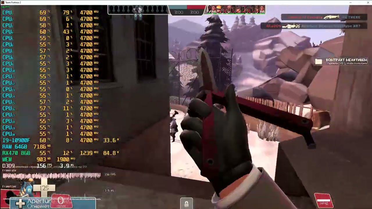 Game: Team Fortress 2 Сomputer characteristics: Socket: LGA 1200 Motherboard: MSI MAG B560 MORTAR WIFI Processor: Intel core i9 10900F 2.8GHZ Liquid cooling systems: ID-Cooling FROSTFLOW X 360 RAM: 64GB DDR4-DIMM 2933 GPU: AMD Radeon RX470 8GB ROM: M2 SSD 256 OS+M2 SSD GAME+HDD 500GB+HDD 2TB+HDD 1TB Video in FULL HD resolution. Operating system: Windows 10 Pro --- Timecodes - 0:00 - The beginning of the video