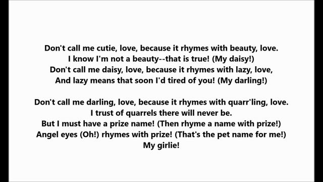 Ada Jones and Billy Murray sing “Cohan’s Pet Names” on Edison Amberol 78. "Cohan's Pet Names" Ada Jones & Billy Murray 1908 Song by George M. Cohan They get names for pet names that are perfectly ridiculous to say. These nicknames are trick names that the lovers call each other every day. There's Piggy and Wiggy and every other sort of foolish name. They're gushy, they're mushy, but the lovers seem to like them just the same! My honey! Don't call me honey, love, because it rhymes with money, love, And money's for the mercenary kind! (My baby!) Don't call me baby, love, because it rhymes with maybe, love, And maybe means a doubt is in your mind! (My dearie!) Don't call me dearie, love, because it rhymes with weary, love, And weary means unhappy we will be! But I must have a pet name. (Then rhyme a name with love!) Turtle dove rhymes with love! (That's the pet name for me!) They make names for fake names that are just as numerous as summer flies! They're wild names, they're child names that your mother used to sing in lullabies! There's Frou-frou, there's Jou-jou-- they always get a soft and fluffy name! They're fine names--they're shine names, but the lovers seem to like them just the same. My cutie! Don't call me cutie, love, because it rhymes with beauty, love. I know I'm not a beauty--that is true! (My daisy!) Don't call me daisy, love, because it rhymes with lazy, love, And lazy means that I'd soon tired of you! (My darling!) Don't call me darling, love, because it rhymes with quarr'ling, love. I trust of quarrels there will never be. But I must have a prize name! (Then rhyme a name with prize!) Angel eyes (Oh!) rhymes with prize! (That's the pet name for me!) My girlie! Don't call me girlie, love, because it rhymes with early, love And I would rather sleep and dream of you! (My dreamer!) Don't call me dreamer, love, because it rhymes with schemer, love, And schemer means a lover who's untrue! (My lily!) Don't call me lily, love, because it rhymes with silly, love, And silly means there's something loose up here! But I must have a pet name!... Ada Jones & Billy Murray “Cohan’s Pet Names” on Edison Amberol 78 LYRICS HERE = George M. Cohan song
